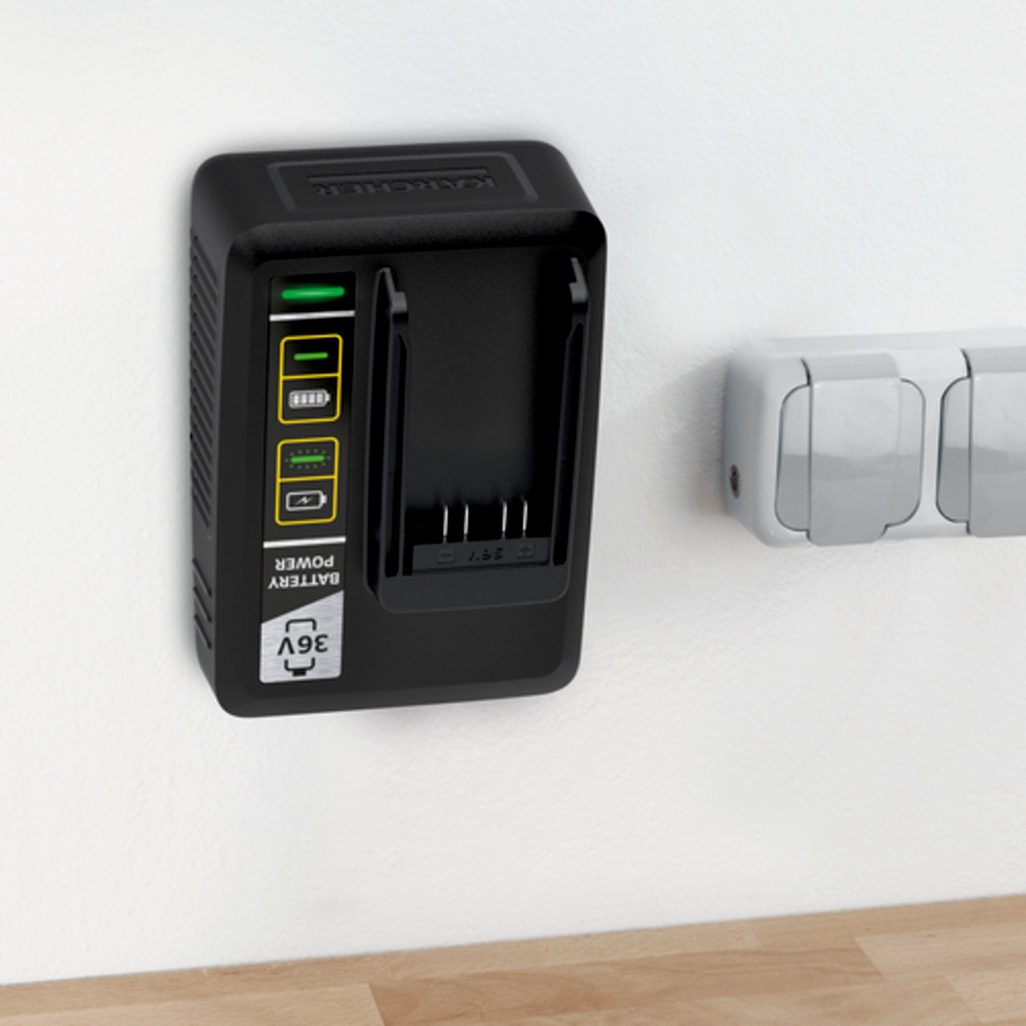 Быстрозарядное устройство для любых сменных аккумуляторов Kärcher на платформе 36 В в кратчайшее время полностью восстанавливает их энергоемкость – например, для заряда аккумулятора Kärcher Battery Power 36 В / 2,5 Ач до уровня 80 % ему достаточно 48 минут. Конструкция устройства предусматривает возможность его крепления на стене.